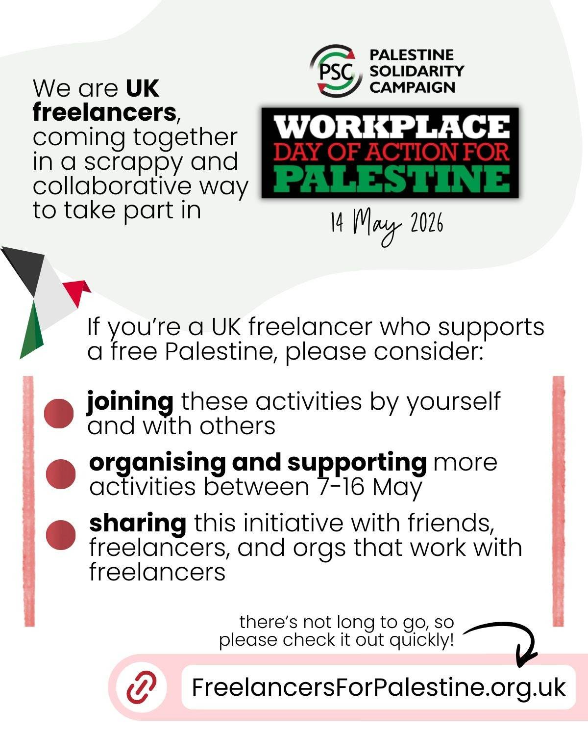 As freelancers, we may not have typical workplaces, but inspired by this day, we can still put time into better aligning our own work/working practices with the Palestinian cause. Free from larger organisations, there might even be unique and radical ways we can act in solidarity with Palestine!